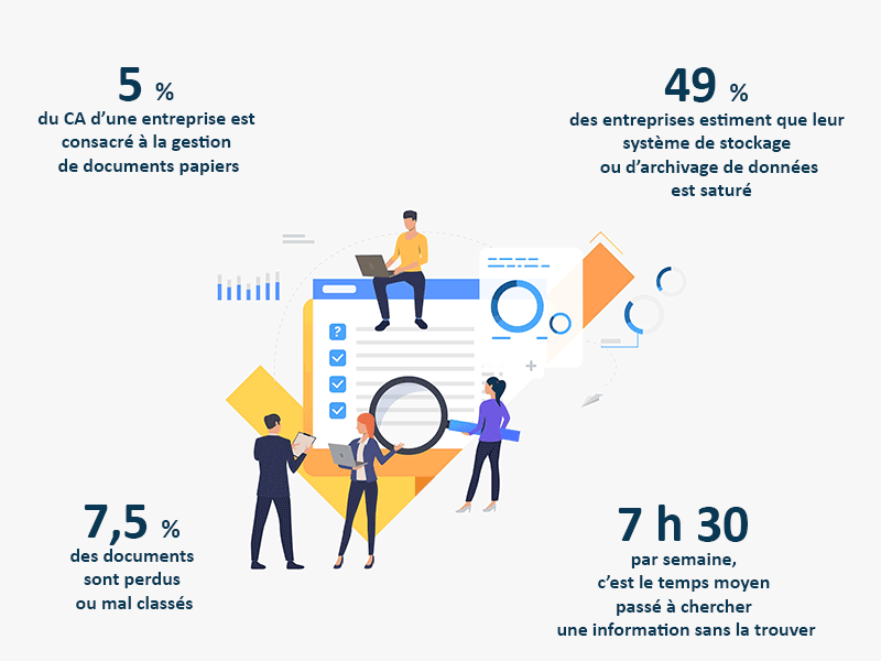 Le principal enjeu de la mise en place d’une GED est le gain de productivité, souvent évalué entre 20 % et 40 % de réduction du temps de recherche manuelle.